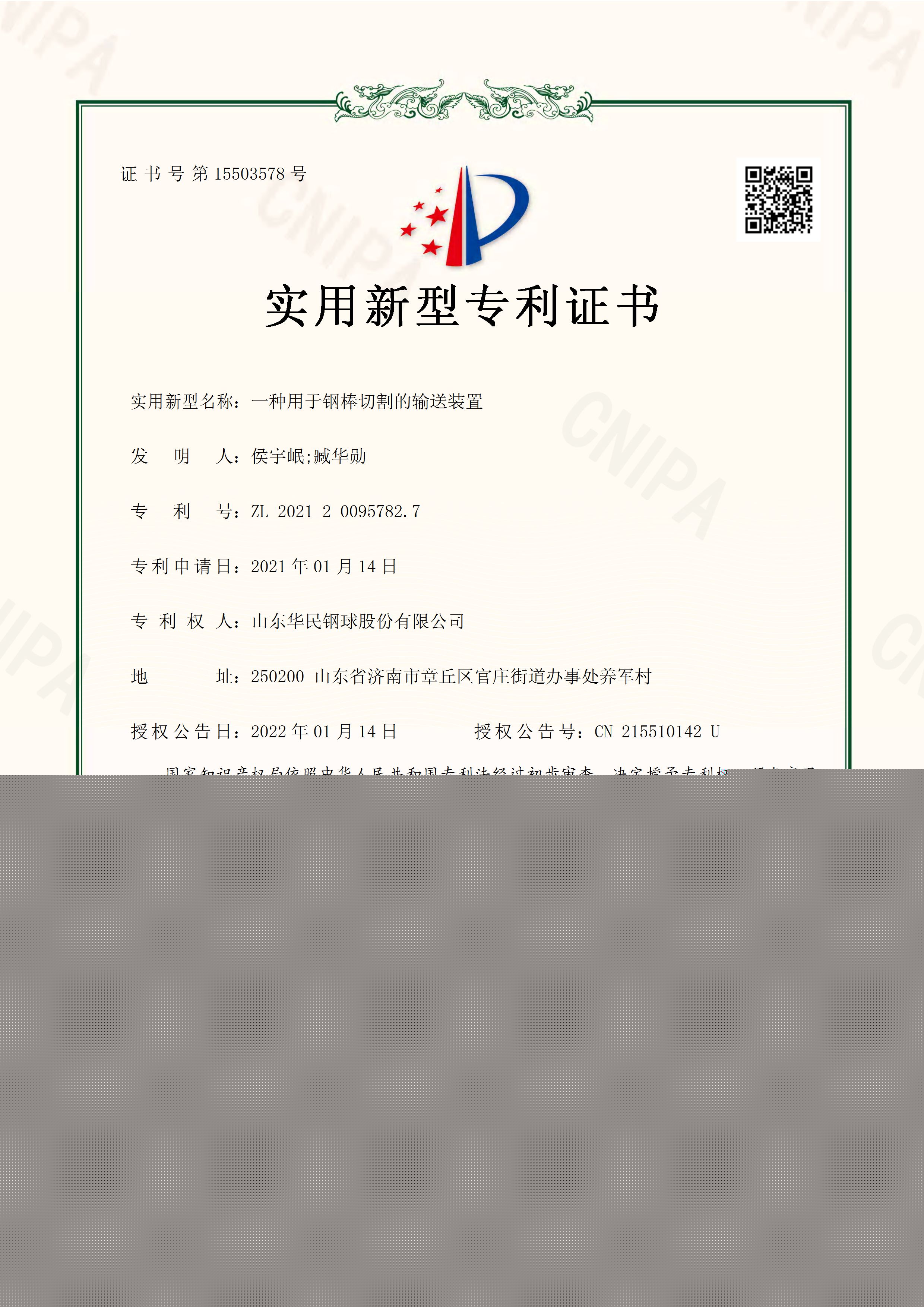 一種用于鋼棒切割的輸送裝置實(shí)用新型專(zhuān)利證書(shū)
