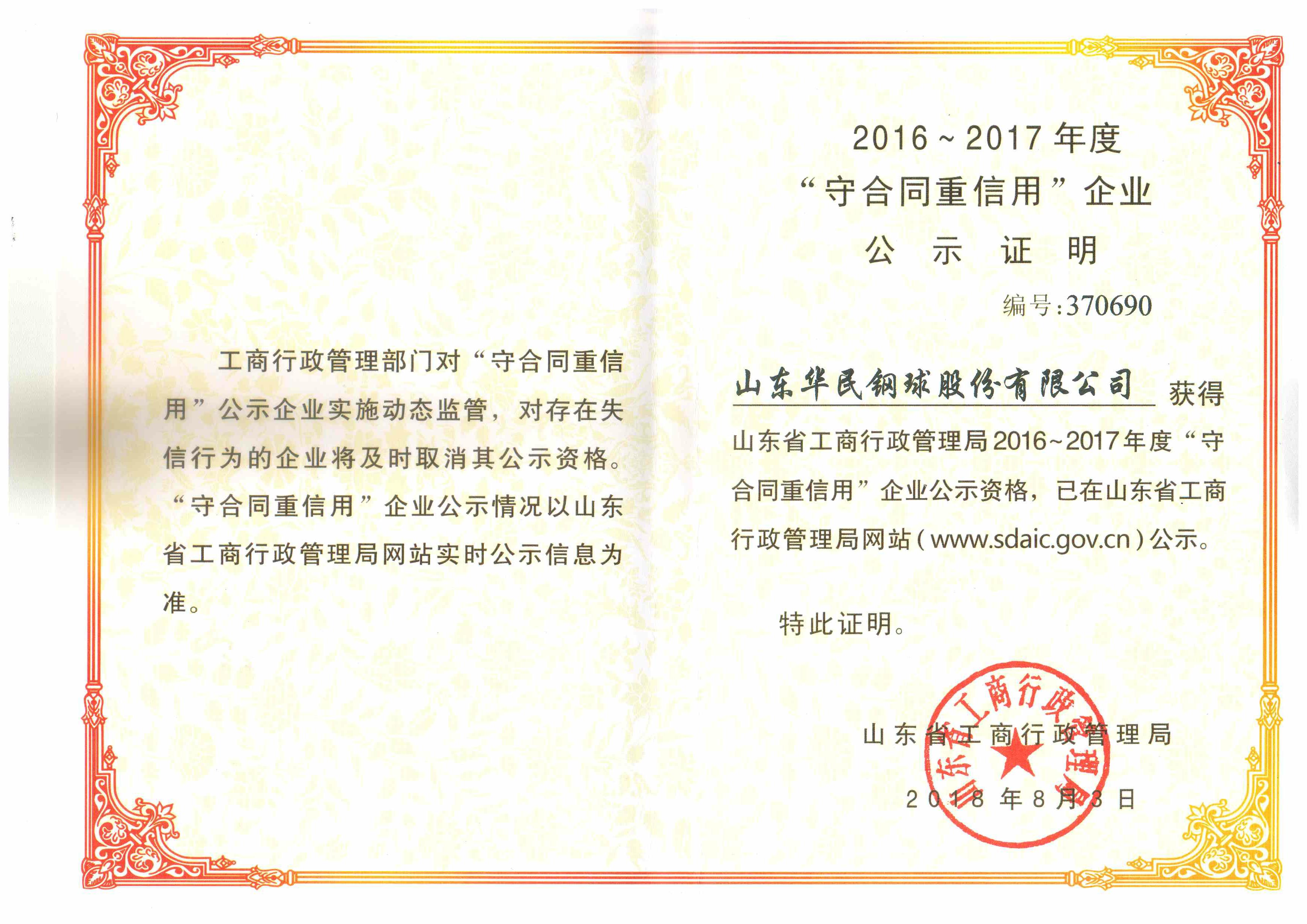 山東省守合同重信用證書(shū)